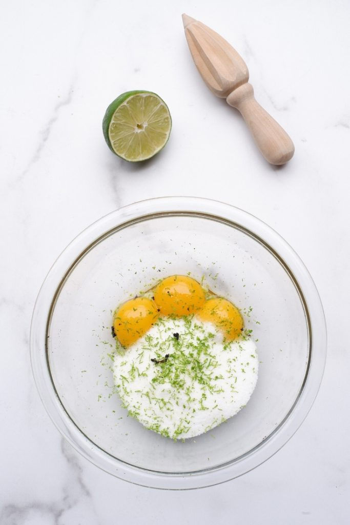 בקערה בינונית חסינת אש, נשים את הסוכר והחלבונים. מיץ, גרד ליים/לימון וגרגריי וניל מחצי תרמיל (אופציה).